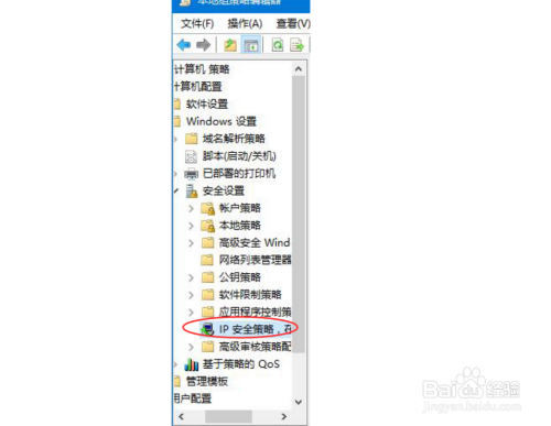 在打开当地组策略编纂器界面中,在左侧的树状列表中选择windows设置里的平安设置子目次,ip平安策略。