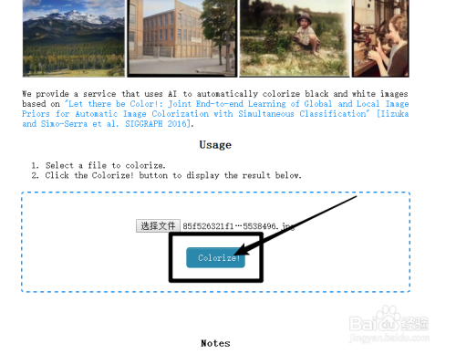 选择适才我们下载保留的口角照片,最后我们点击【Colorize!】如图所示