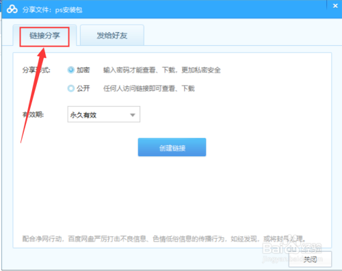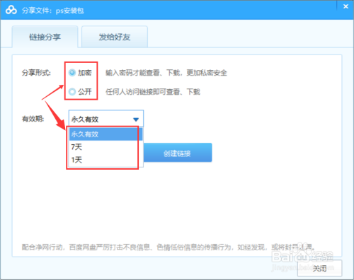 链接分享我们可以选择以加密或者公开的形式,并且还可以选择链接的有用性,然后点击建立链接。