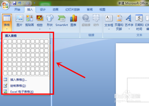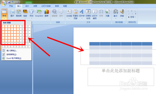 若是我们插入的是6行6列表格,我们鼠标点击框中的第一个往下移动不松手,直至显示6乘6表格即可松手,这时我们可以看到右侧的幻灯片中已经插入表格;