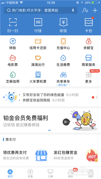 我们打开我们的付出宝app,进入首页之后,就可以或许看到中心有一个提醒叫做铂金会员免费福利,点击进入。