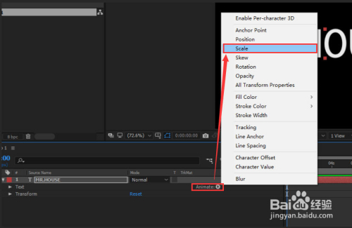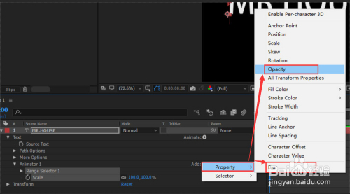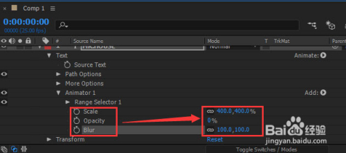 睁开文字层,进入Text属性,点击animate(动画)增添scale(缩放),再给animator增添property(特征)--opacity(透明)和blur(恍惚)
