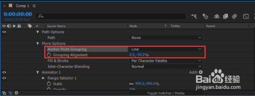 在option中,我们可以把grouping alignment(编组对齐)的Y轴改为-50%,让动画年夜致发生在文字的中间位置。将anchor point grouping(定位点编组)改为line(行)。