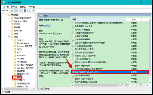 在登录对应的右侧窗口中找到并左键双击:埋没快速用户切换的进口点;