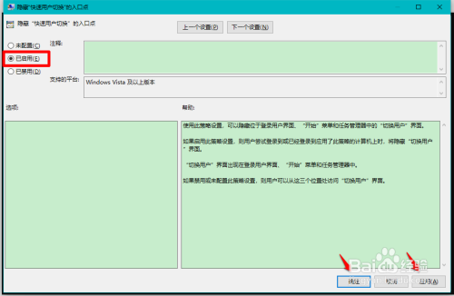 在 埋没快速用户切换的进口点 窗口中,我们点击:已启用 - 应用 - 确定。