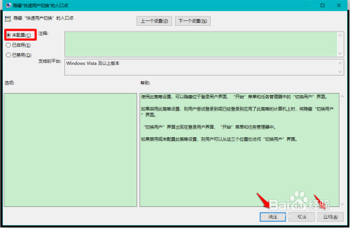 利用方式二埋没快速切换用户功能,可进入当地组策略编纂器,在 埋没快速用户切换的进口点 的窗口中,将【已启用】更改为【未设置装备摆设】或【已禁用】就可以恢复Win10 系统速切换用户功能。