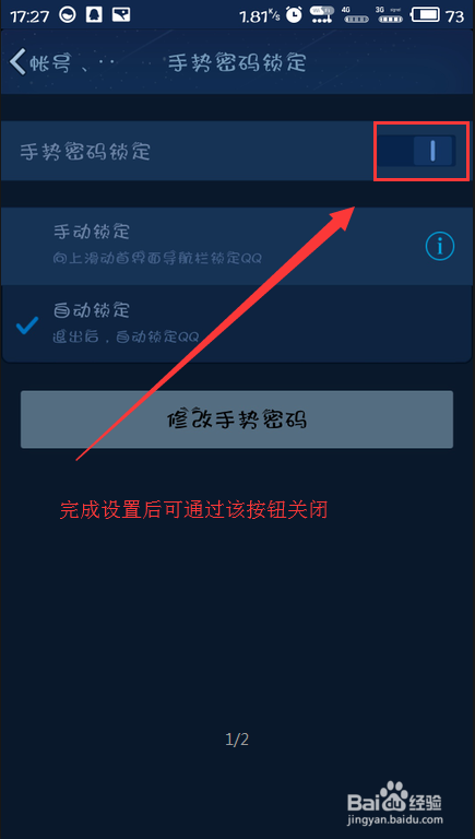 若是你需要封闭手势密码锁定,你只需进行前五步操作,然后进入手势密码锁定设置页面中将下图按钮打消即可完当作封闭。