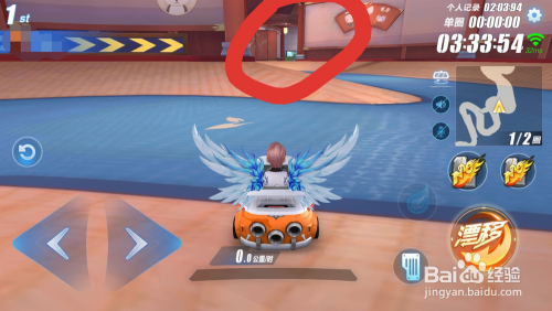 经由过程弹跳圈进入近道后,来到下一个近道,这里我们需要走右边红圈标注的近道,注重操纵小漂调整车身偏向