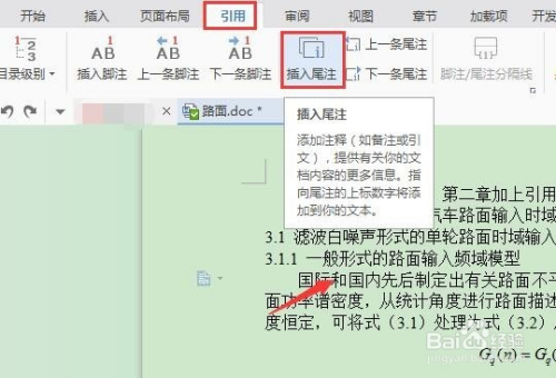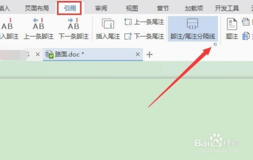 接着切换到引用页,可以看到从头至尾注按钮,先在文档某处,点击光标,接着点此按钮。此时会主动跳到下图2位置,即文档结从头至尾处,并有朋分线,点箭头指的按钮,可以不显示此直线。