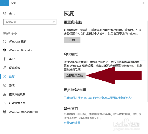 用户依次在"起头(按钮)"上左键单击,在"启动"中"设置(图标)"上左键单击,在"设置"中,在"更新和平安 (列表项目)"上左键单击,在"恢复 (列表项目)"上左键单击,在"当即从头启动(按钮)"上左键单击。