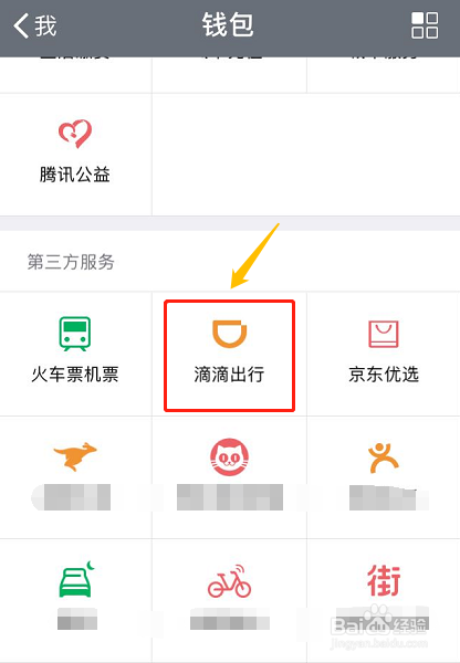 ①打开微信点击"我"-"钱包",然后在第三方办事里即可看到"滴滴出行"办事选项了,如下图;