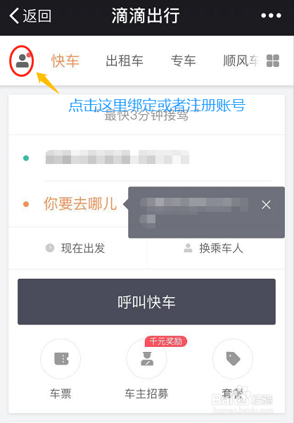 ②点击该项进入今后,我们首先同样需要注册一个账号,若是是老用户的话,点击左上角的头像图标绑定之前的账号,然后叫车界面就和滴滴软件一样了,如下图所示...