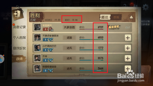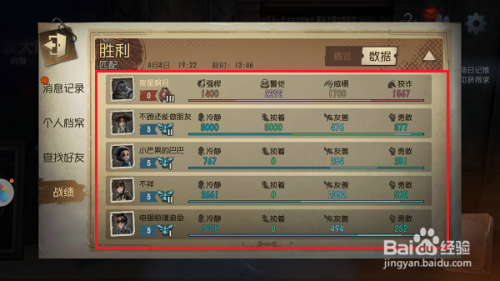 第五步进去第五人格对局详情界面之后,可以看到游戏对局时候,每一位玩家获得的分数,如下图所示: