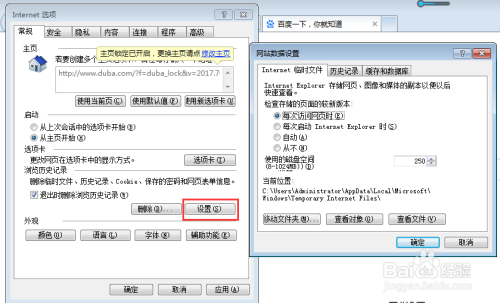 点击常规下设置按钮,弹出如下图窗口,然后点击汗青记实可以设置汗青记实保留网页的天数、Internet 姑且文件、缓存和数据库。