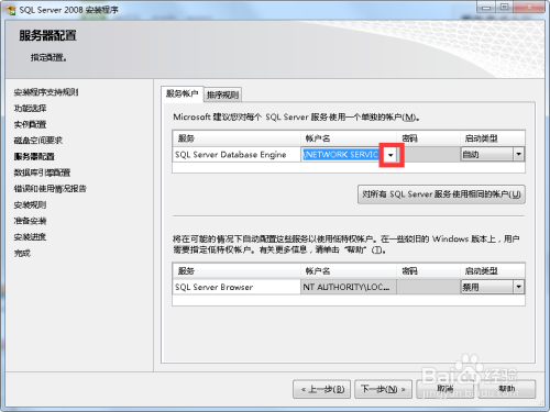 办事器设置装备摆设,选择一个办理员账户(如下图)