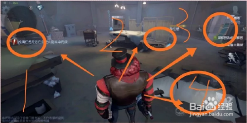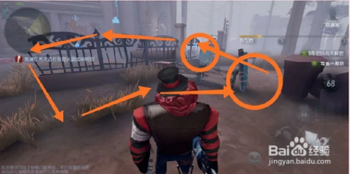 第五步:当我们在如下图所示的位置时,我们可以按图示逆时针偏向与监管者绕圈,伺机放倒板子让监管者踩板子。