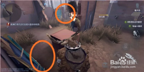 第二步:当我们在如下图所示的废墟位置时,我们可以将红色圈中的这两个板子放倒,操纵监管者的踩板时候甩脱监管者。
