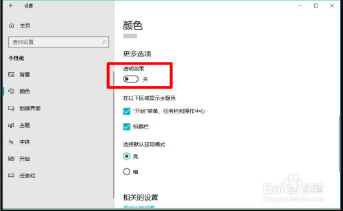路径:Windows 设置 - 个性化 - 颜色,在对应的右侧窗口中,点击封闭 透明结果,使开关处于【关】的位置。
