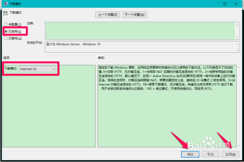 在打开的下载模式窗口中,点选:已启用,下载模式点选:Internet(3),再点击:应用 - 确定;