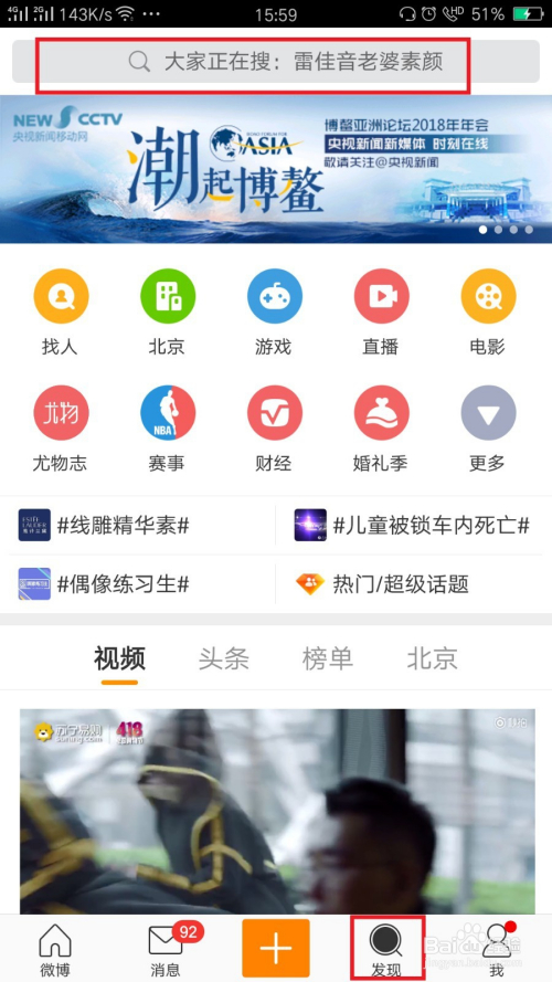 第二步:打开微博后,我们点击发现,然后点击上方的搜刮。
