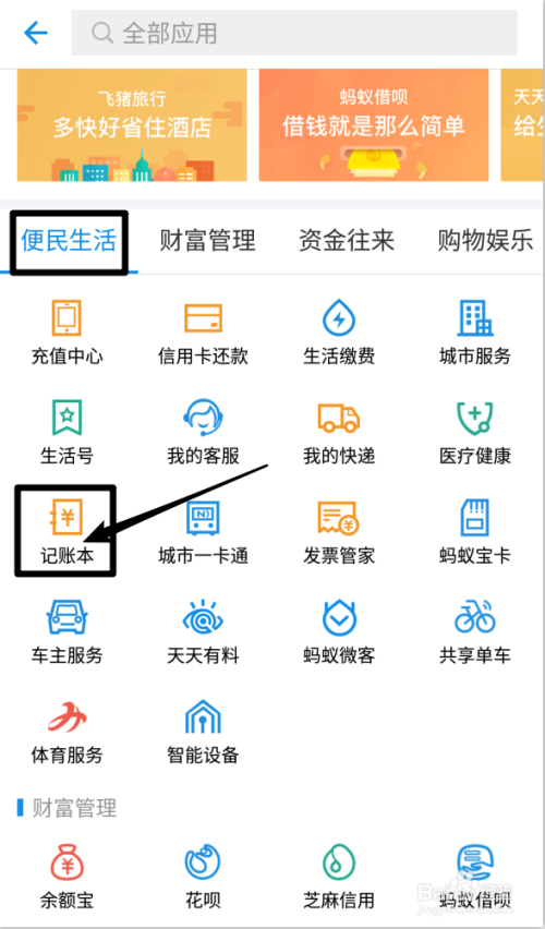 在该界面中找到【便平易近糊口】中的【记账本】,如图所示