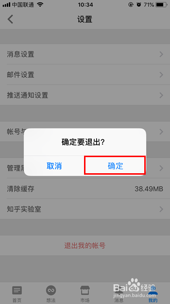 第四步,退出登录。在设置页面下方有-退出我的账号-的红色字体按钮,点击该按钮,如下图所示: