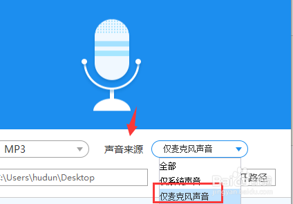 选择好格局今后就可以在声音来历选项,因为我们要录制的是麦克风的声音,所以在这个选项我们选择仅麦克风声音。