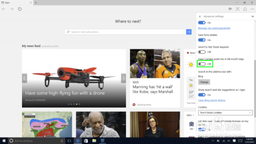 单击其下方的滑块地点的位置,即让Cortana在Microsoft Edge中协助我。