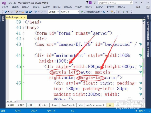 打开一个已有的Visual Studio作品,本例为TwoFish网站,网页文件为Default.aspx。