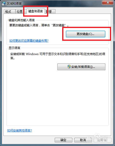 第三步:进入【区域和说话】界面,如下图所示,我们点击上方的【键盘和说话】一栏,然后点击【更改键盘】按钮。
