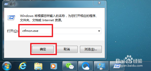 第八步:若是上述方式没有解决问题,桌面系统说话栏输入法仍是不见的话,我们按下快捷键【win+R】,打开【运行】,【打开】右侧的输入框中输入ctfmon.exe或ctfmon,然后点击【确定】按钮,如下图所示。