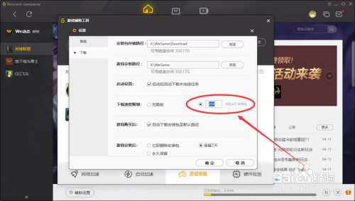 接着,我们就会来到WeGame的下载设置页面,在这个页面里我们可以点击‘无限制 ’按钮,把游戏下载速度设置为不限制下载速度 。