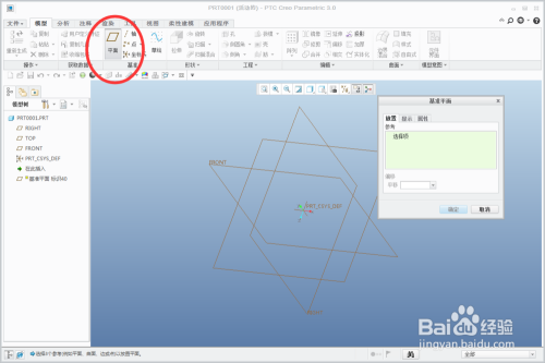 在窗口上方的模子功能区点击“平面”建立基准平面;(如图中所示)