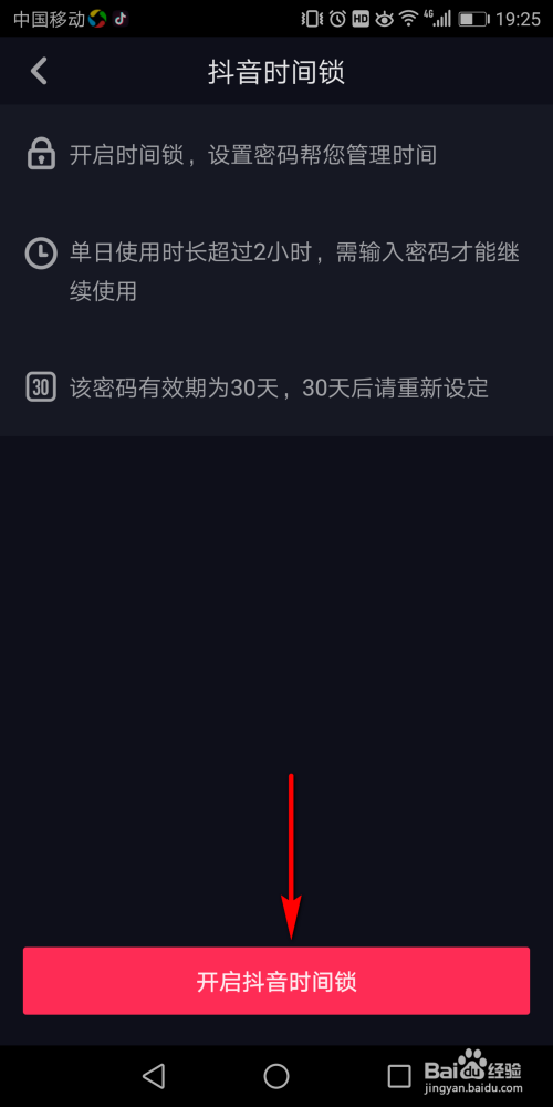 进入到时候锁的设置页面后,在页面最下方点击图示位置的【开启抖音时候锁】。