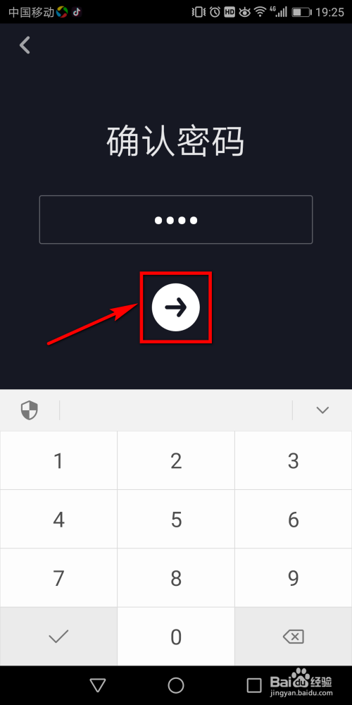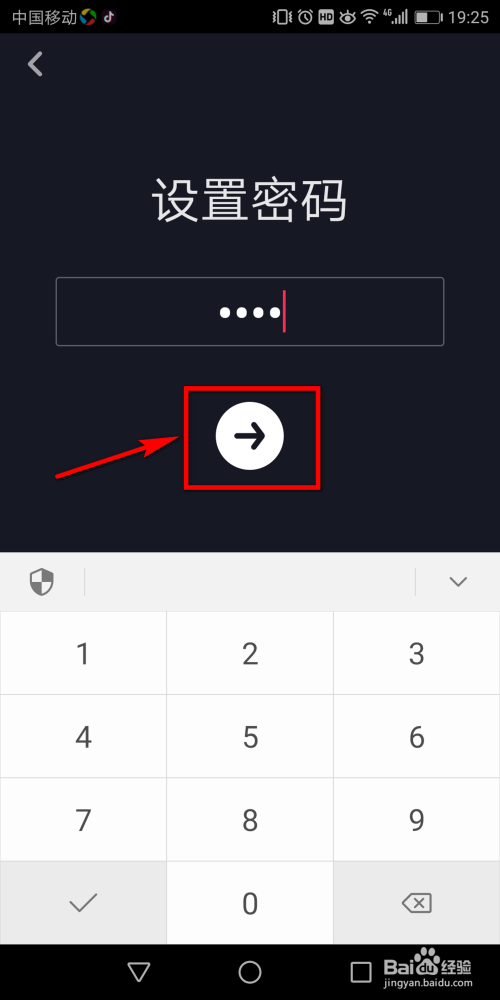 然后页面就会主动跳转至密码设置页面,密码只能设置四位,设置好之后点击图示位置的标的目的右箭头。