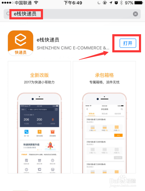 第一:要想利用e栈快递员,首先打开我们手机的软件商铺,输入e栈快递员,点击下载并安装。