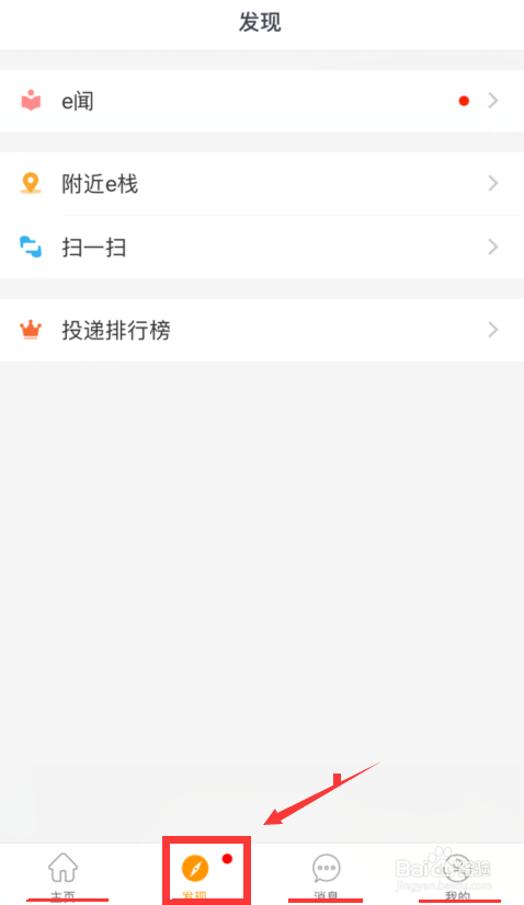 第三:进入e栈快递员之后,我们在最下方可以看到里边有四个菜单列表,别离是本家儿页,发现,动静,我的。