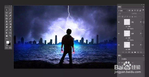 打开素材光效图片,移到模特图层底下,调整图片比例大小,点窜图层的夹杂模式为叠加模式
