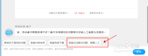 这时辰,象仔会主动抛出一个近似解决问题的方案给你,因为他回覆不了你的这个问题,所以就来一个恍惚的问题谜底给你,点击未解决进入下一步。