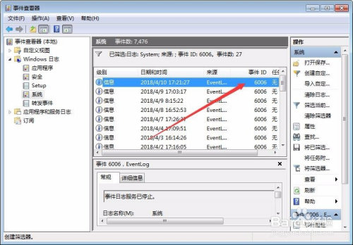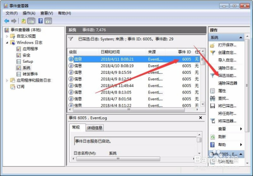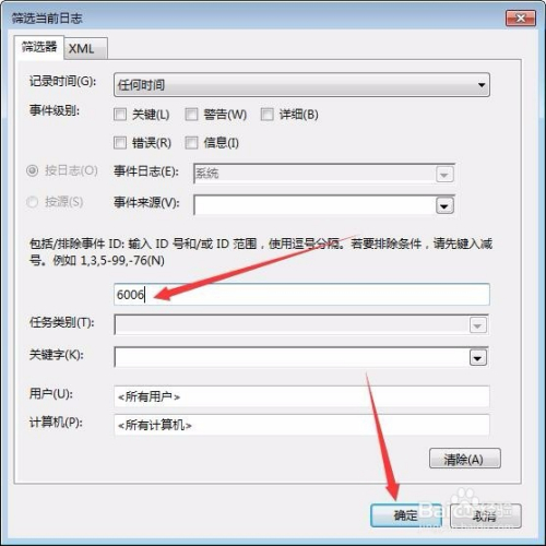 在右侧选择筛选当前日记,其他项都不要动,只需要输入事务ID处输入6005暗示开机时候,6006暗示关机时候,如下图所示。