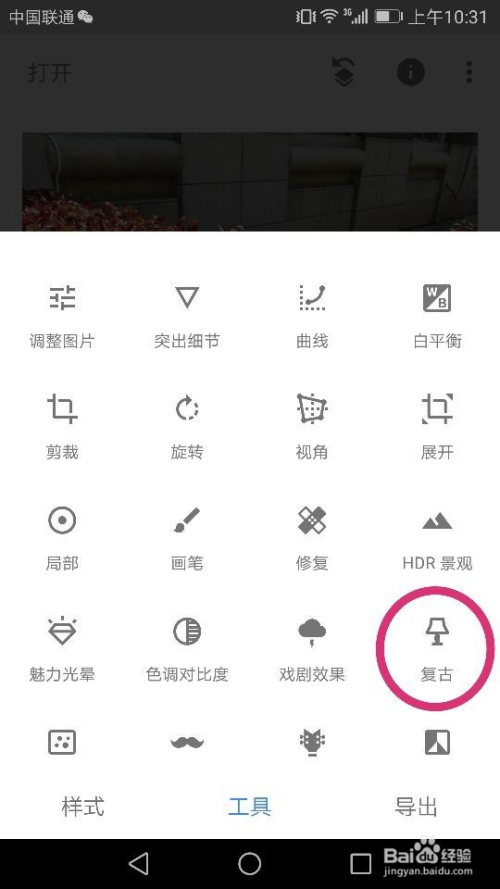 首先,利用复古东西建造图片,可以照片做旧,使照片有泛黄的结果。在手机大将下载的Snapseed软件打开,再手机当地照片中选一张照片进行导入到软件中,再点击屏幕最下方的位于中心的东西选项按钮,弹出包含所有东西选项的界面。
