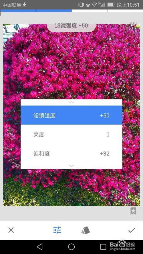 然后,在选好HDR景不雅选项后,再点击屏幕最下方一栏中的左边的按钮,呈现滤镜强度、亮度和饱和度的操作,可以进行自界说的曝光操作。