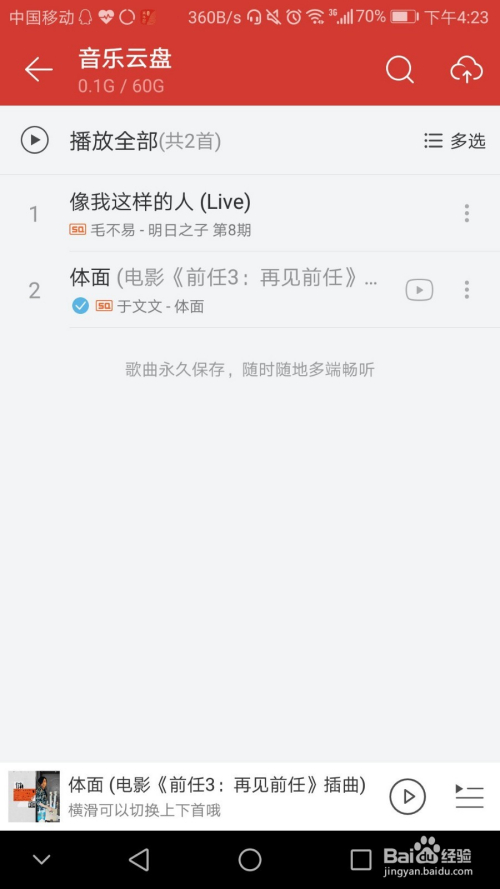 第五步,打开手机网易音乐app,找到网易云盘,就会呈现刚在pc端保藏的音乐。