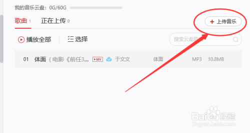 第三步,点击打开界面的右上角的上传音乐,如下图,选择当地音乐的路径。