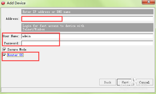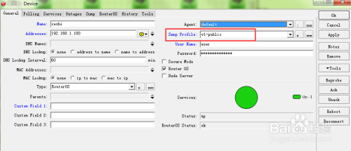 Address处填写需要监控的ROS的ip地址,User Name/Password 也是ROS的用户名/密码,勾选【Router OS】
