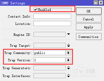 勾选【enabled】,Trap community选择默认public,Trap version选择1(选其它版本也可,后面dude里也要连结一致即可,本次以1为例)