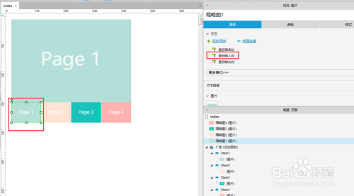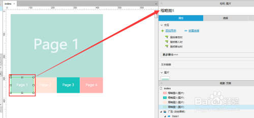 6. 在本家儿页面中的【动态面板】下添加适才四个告白页的缩略图:拖入【图片】-->调节第一个缩略图尺寸和位置-->复制出剩下三个并调整好位置-->给每个缩略图导入对应告白图片。