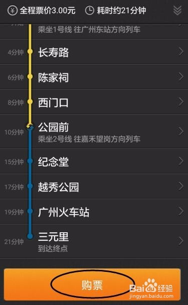 呈现完整、具体的路线指示列表,拉倒底部,发现购票字眼,点击
