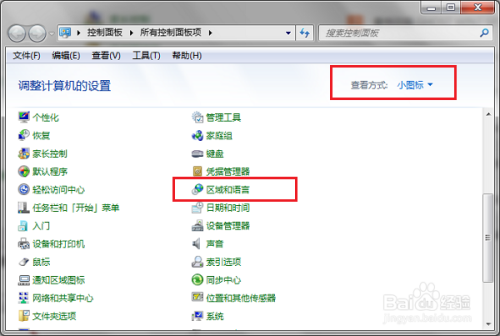 第一步我们首先需要知道呈现error launching installer错误的原因是界面说话和非unicode法式说话纷歧致造当作的,需要从头设置区域说话,打开节制面板,以小图标的体例查看,点击区域和说话,如下图所示: