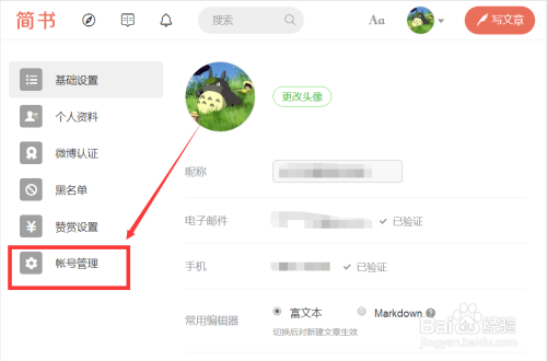 进入简书的设置界面,在左侧功能栏中找到【账号办理】并点击,如图: